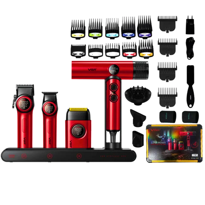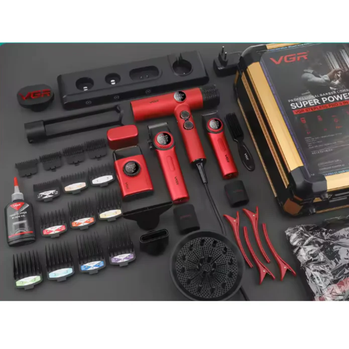 El Combo Kit VGR Professional 4 en 1 es un set completo y profesional diseñado para el cuidado y estilizado del cabello y la barba, ideal tanto para uso en barberías como para uso doméstico avanzado. Este kit reúne cuatro herramientas esenciales en una sola maleta práctica y portátil, facilitando su transporte y almacenamiento.
