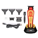 Patillera profesional wmark DREAMFYRE NG-8230 9000RPM Cuchilla fija de acero inoxidable DLC con cuchilla móvil de cerámica. Velocidad del motor: 9000 RPM. Batería de litio de 2000 mAh. Carga completa de 2.5 horas para aproximadamente 240 minutos de uso. Con indicador de capacidad de batería LED. Accesorios: 3 peines guía (1/2/3 mm), cepillo de limpieza, aceite lubricante, base de carga y cable USB.