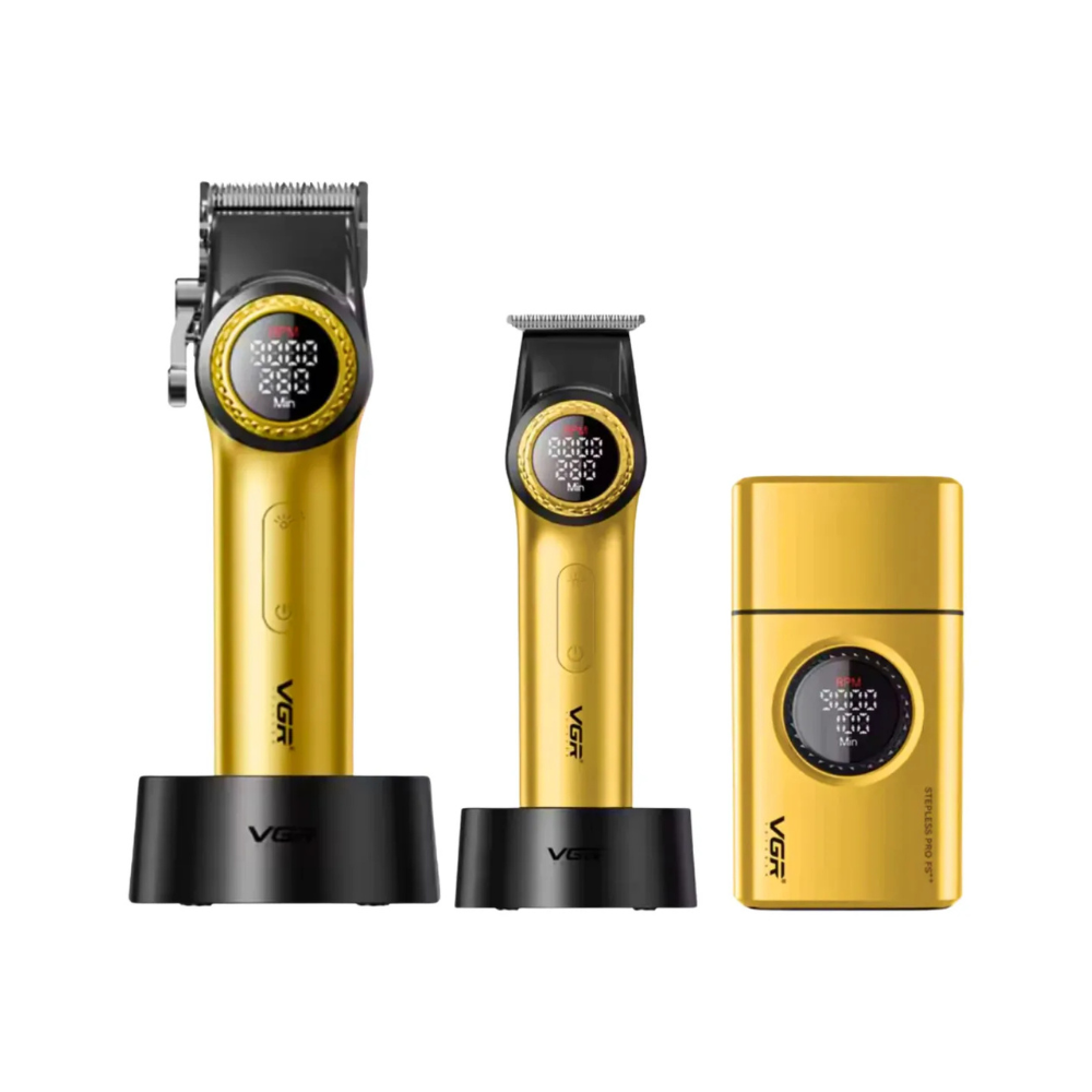 Eleva tu estilo con el exclusivo Barber Combo VGR Gold, un set completo ideal para barberos profesionales y uso personal. Este combo incluye tres herramientas esenciales con diseño elegante en color dorado, potencia de alto rendimiento y precisión inigualable.
