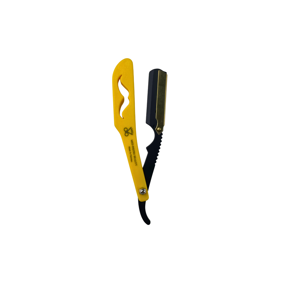 La navaja de afeitar profesional Med Instru Beauty es una herramienta de alta gama diseñada para barberos que buscan un equilibrio perfecto entre un estilo sofisticado y una funcionalidad excepcional. Este modelo destaca por su vibrante mango en color amarillo sólido, que incorpora un elegante calado artístico en el cuerpo, diseñado para reducir el peso de la herramienta y proporcionar una agilidad superior en cada movimiento. La combinación visual se eleva con un cabezal metálico en negro mate y una placa de sujeción en dorado brillante, creando una estética de lujo que resalta en cualquier estación de trabajo.