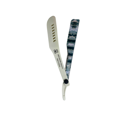 El diseño ergonómico es una de sus mayores fortalezas. El portahojas cuenta con un lomo dentado de precisión que ofrece un apoyo seguro para los dedos, permitiendo un control milimétrico durante el perfilado de barbas, contornos de cuello y acabados detallados. Su estructura está perfectamente equilibrada para minimizar la fatiga de la mano, asegurando un rasurado fluido y profesional.