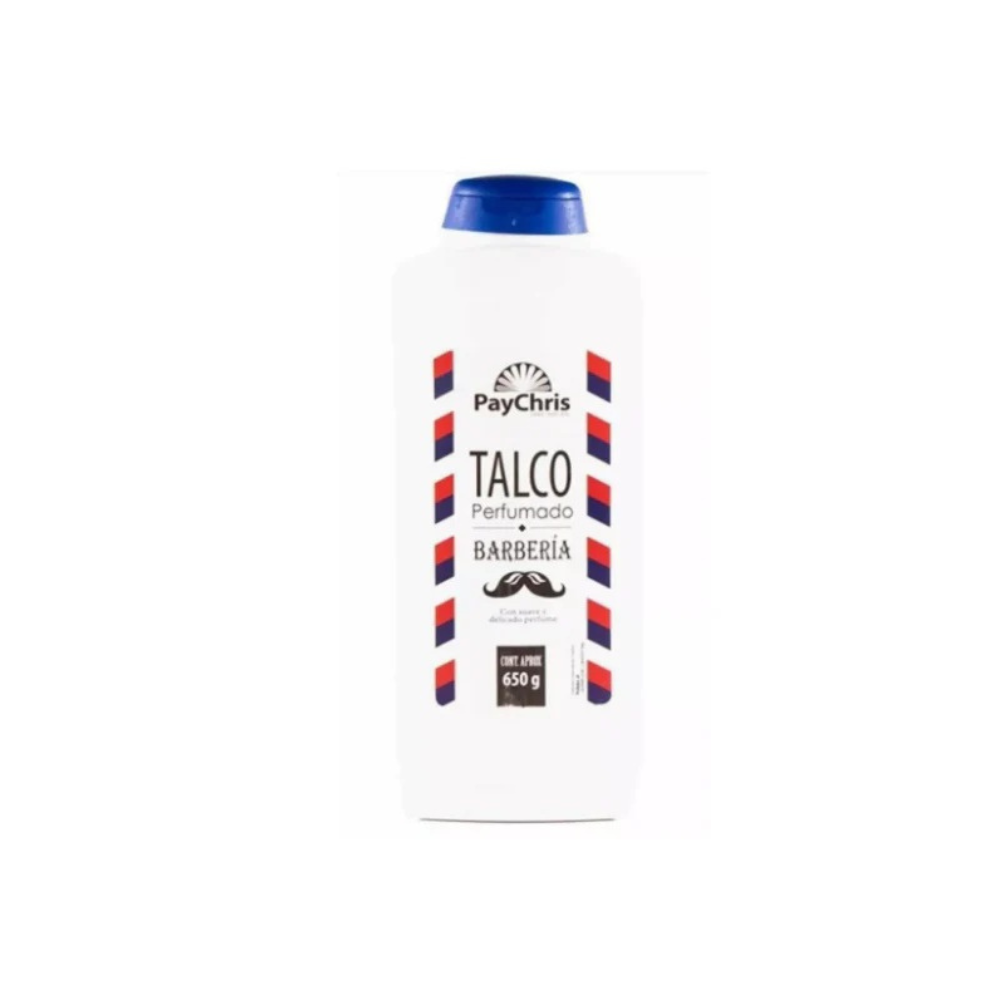 Talco perfumado barberia 650g paychris Talco perfumado Pay Chis 650g. Es importante este producto, ayuda absorber la humedad de la piel y a disminuir la irritación que puede producirse al afeitarse tanto la barba como otras zonas. Resultan muy útiles antes de la depilación porque aspiran el exceso de humedad y facilitan el agarre de la cera. Además, calman el enrojecimiento y la foliculitis asociada a la eliminación del vello. Talco de agradable aroma ideal para su uso en barbería o peluquería. Es hipoalergenico.