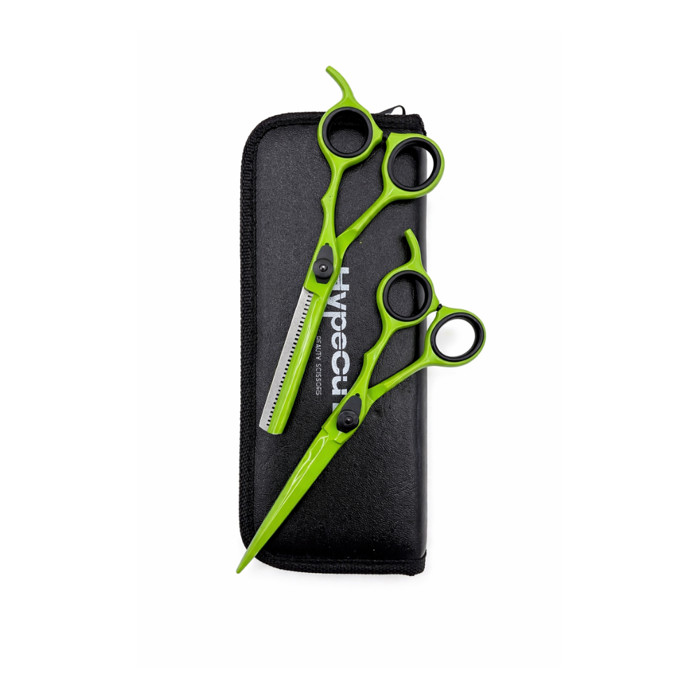 El Set de Tijeras Profesionales Hypocut® Neon Green Edition en su versión de dos piezas es la elección definitiva para el estilista que busca una herramienta con una identidad visual electrizante sin comprometer la precisión técnica. Diseñadas para destacar tanto en el salón como en redes sociales, estas tijeras combinan un color neón de alto impacto con una ingeniería de corte optimizada para las manos más exigentes.